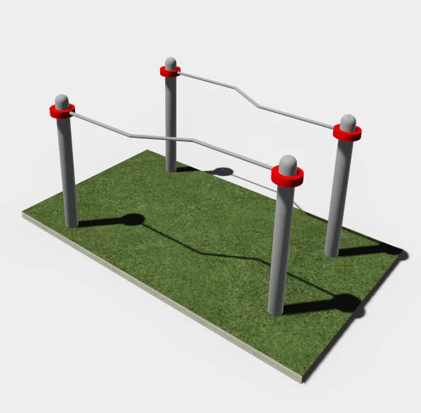 Конструкция включает в себя четыре вертикальных столба разной высоты (1100 мм и 1400 мм) и две жерди длиной 1790 мм каждая, которые фиксируются на столбах с помощью хомутов. Такая комплектация позволяет адаптировать оборудование под различные требования пользователей и обеспечивает легкий доступ на инвалидной коляске благодаря специально предусмотренной высоте подъема от 1100 мм до 1400 мм от уровня земли.