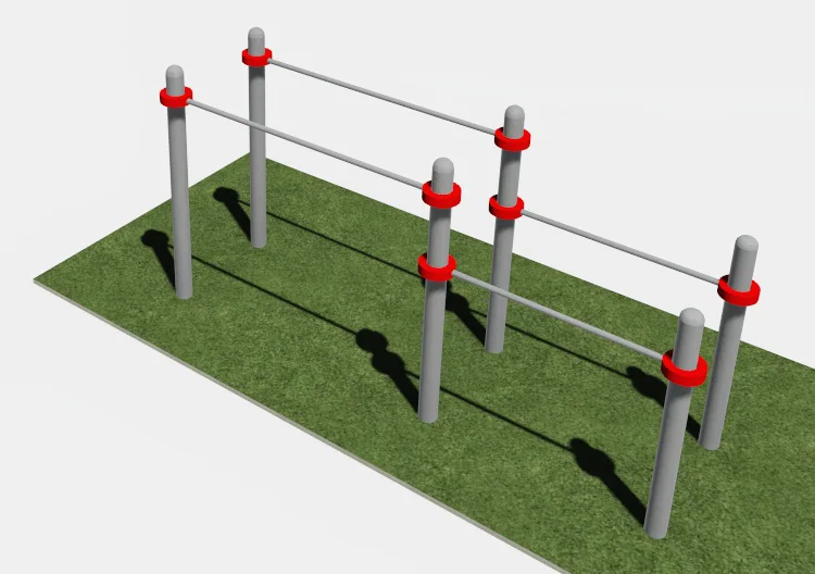 Перекладины фиксируются на опорах при помощи хомутов, обеспечивая прочность и стабильность конструкции. Общая длина комплекса не превышает 3300 мм.