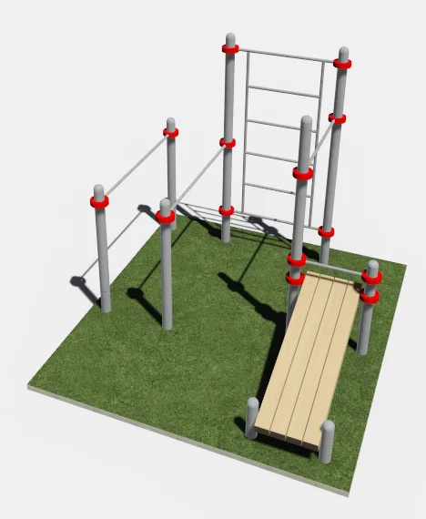 Составляющими данного комплекса являются шведская стенка, скамья для пресса, турник и брусья классические. Шведская стенка крепится на высоте 2500 мм к опорным столбам высотой 2600 мм.