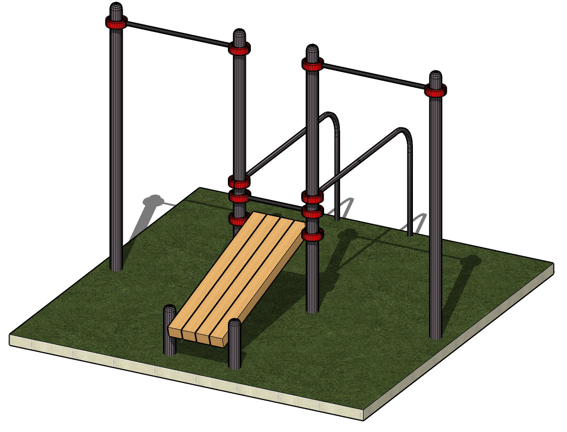 К опорным столбам высотой 2600мм крепится перекладина турника длинной 1200 мм на высоте 2400 мм и шведская стенка. Шведская стенка шириной 1200 мм, ширина секции 340 мм. Скамья для пресса фиксируется на высоте 1300 мм при помощи хомутов. Скамья для пресса представляет собой брус сечением 1800*450*45 мм. Общая длина комплекса составляет не более 3100 мм.