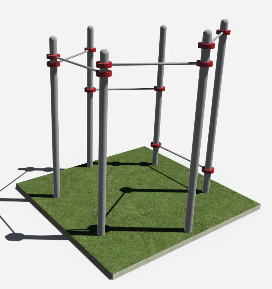 Шесть перекладин длиной 1200 мм, устанавливаемых на различных высотах: 2400 мм, 2100 мм, 2000 мм, 1900 мм, 900 мм, 200 мм от поверхности основания.